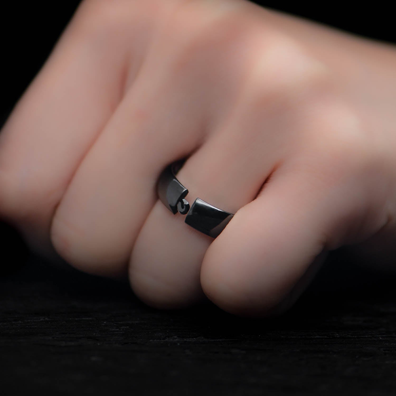 Black titanium wedding band with tension set diamond, 6mm mens ring, polished domed profile, free engraving available, displayed on white background.