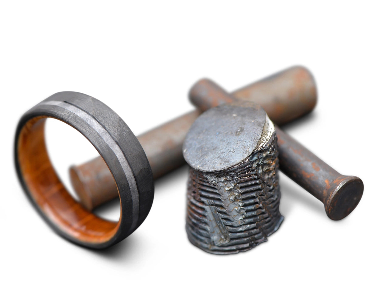 Rich in family heritage, this rings combines elements from a generational Iowa farm. It is made using a steel lug nut from the grandfather's John Deere tractor, embedding a piece of the family's farming legacy.
