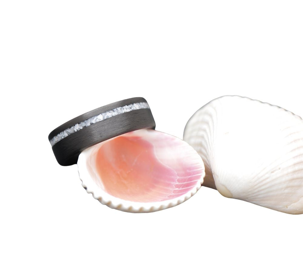 This carbon fiber ring, inlaid with sea shells from their proposal beach, captures the essence of their blissful engagement, symbolizing a lifelong journey of love.