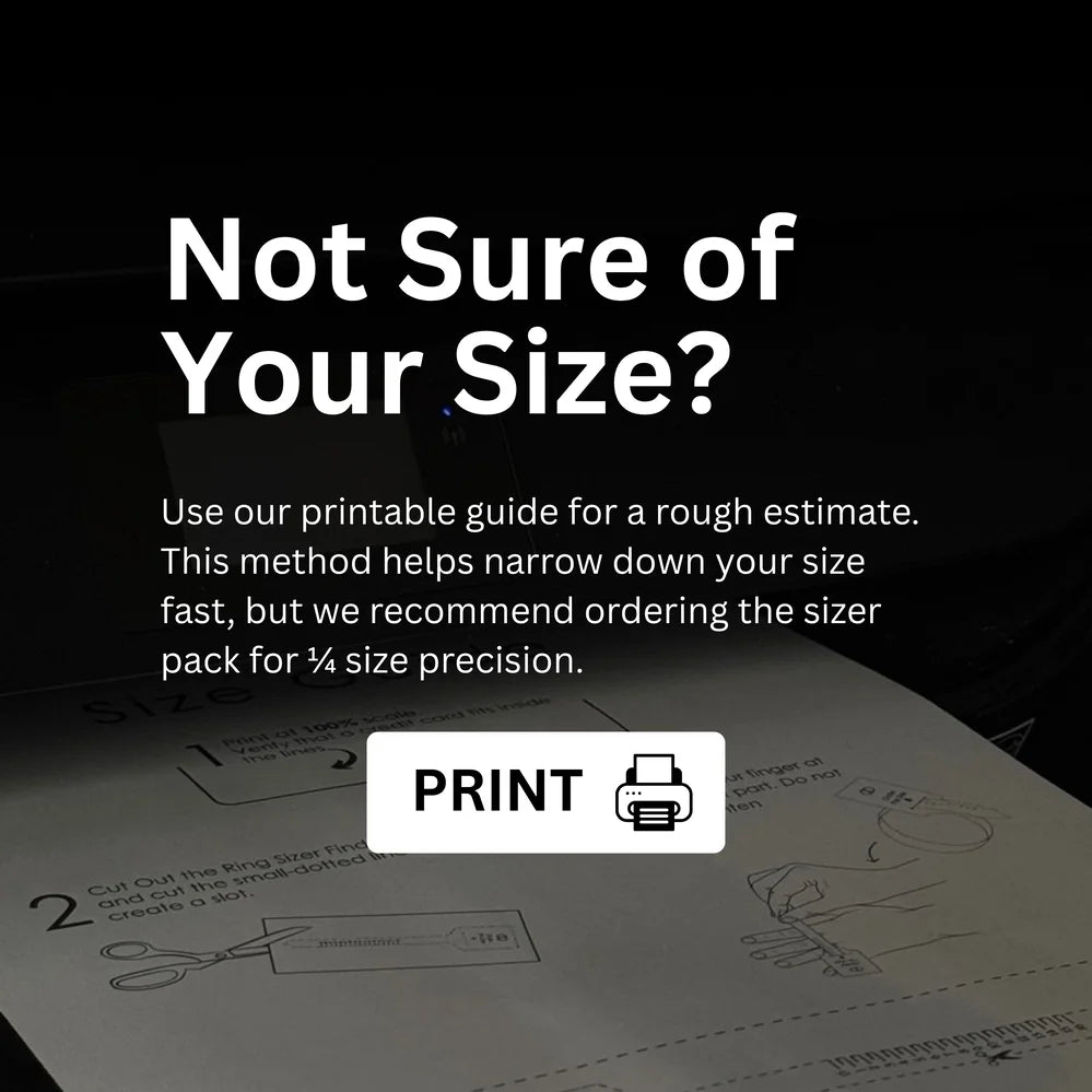 Next, order your ring and add the ring sizer 3-pack. You'll get three sizes: your chosen size, one 1/4 size up, and one 1/4 size down. Try them at home to find your perfect fit.