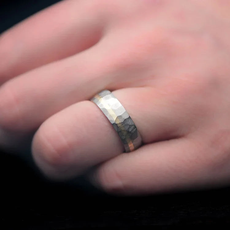 Titanium wedding band with 10KY gold and whiskey barrel oak inlay, featuring a unique faceted design, displayed on a white sea branch, 7mm mens ring with free engraving.