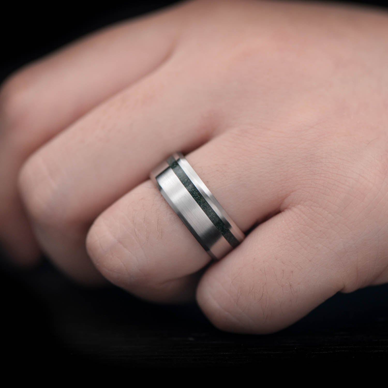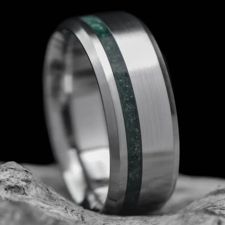 Titanium wedding band with moss agate inlay, 8mm mens ring, brushed bevel profile, unique design, free engraving option, displayed on a white background.